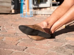 Terug naar dat festival, naar Sarah en haar leerrestjes. Ik dacht: hoe tof zou het zijn als ik mijn eigen schoenen maakte, met zachte, flexibele leren zolen? Ik ontwierp een simpel design, dat klaar was binnen een paar dagen (heerlijk, knutselen!) en vond het super fijn om ze te dragen. Het voelt als lopen op blote voeten, maar dan met net wat meer bescherming. Handig voor prikkelende bosjes, glas op de grond, scherpe steentjes en natuurlijk ook een stuk hygiรซnischer in de stad. En, eerlijk is eerlijk: je krijgt er ook minder rare blikken door, haha!