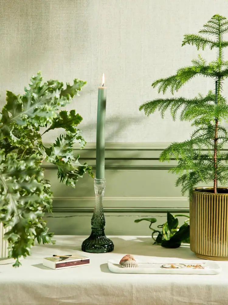 Een harmonieus groene styling met kamerplanten en accessoires: groen in de woonkamer kan zorgen voor een kalme, natuurlijke sfeer. Ook subtiele groene accenten (zoals kaarsen of potten) dragen bij aan een ontspannen gevoel.
