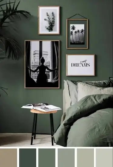 Een rustgevend groen slaapkamerinterieur. Koele, natuurlijke tinten zoals saliegroen of mosgroen zorgen voor ontspanning en harmonie in de slaapruimte. Zachte stoffen en hout versterken het kalme, natuurlijke gevoel.