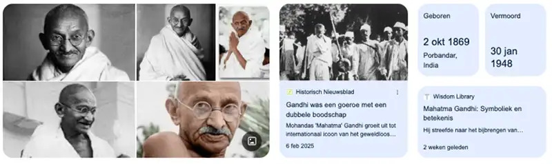 Gandhi is bekend als de leider van de geweldloze onafhankelijkheidsstrijd in India. Hij stond voor principes als waarheid, eenvoud en vreedzaam verzet, en wist daarmee miljoenen mensen te mobiliseren zonder gebruik van geweld.